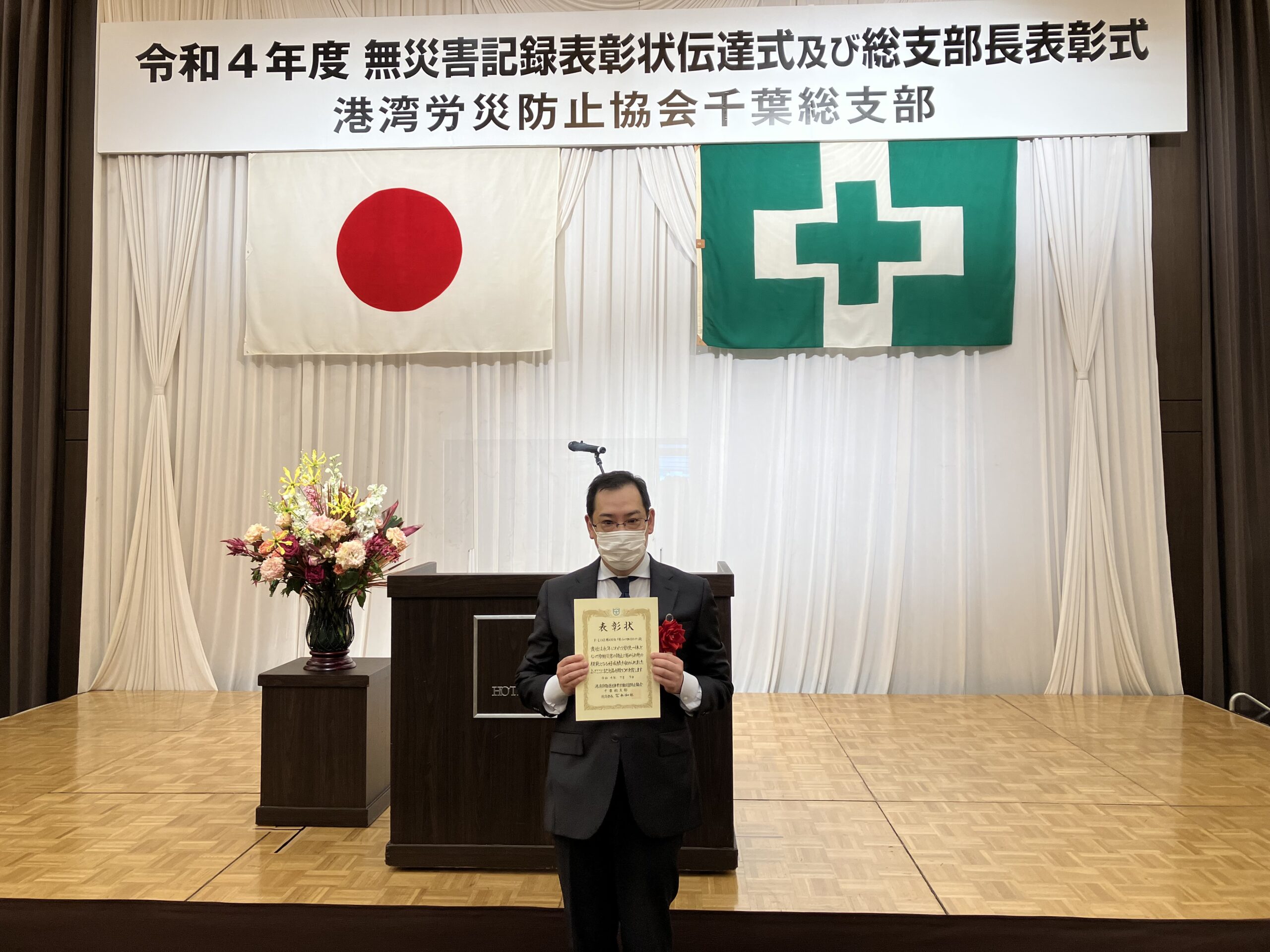 2022.07.20 受賞港湾労災防止協会「優良事業場」表彰を受賞2022年7月5日、港湾貨物運送事業労働災害防止協会様より、当社千葉バルク物流センターが「安全衛生管理優良事業場」として表彰を受けました。当該表彰は、無災害を継続し、協会の災害防止活動に積極的に参加・協力している事業場に対して贈られるものです。千葉バルク物流センターでは、1997年から無災害を継続していることが評価され、今回の受賞となりました。当社は、今後も安全に関する教育やルールの遵守を徹底し、災害防止に努めてまいります。表彰を受けた千葉バルク物流センター長の平鍋 ニュース一覧に戻る