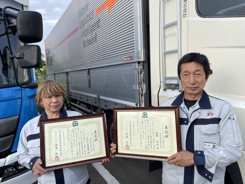 2022.06.28 受賞陸運労働災害防止協会宮城県支部で受彰!2022年5月25日、陸上貨物運送事業労働災害防止協会宮城県支部の第59回通常総会が開催されました。その中で、当社の岩沼物流センターに所属する狩野達也、庄司真由美の2名が3年以上無事故・無違反を継続していることが、陸災防宮城県支部の事業運営に関し、顕著な功績又は労働災害防止に貢献したとして個人表彰を受賞しました。当社はこの受賞を励みに、今後もプロフェッショナルな人財育成に取り組み、交通事故防止に努めていきます。表彰を受けた庄司真由美(左)と狩野達也(右) ニュース一覧に戻る
