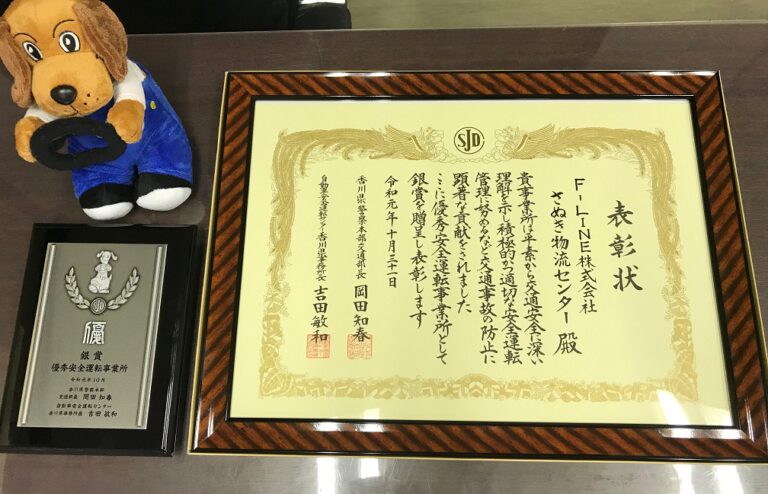 2019.11.15 受賞さぬき物流センターが優良安全運転事業所表彰【銀賞】を受賞しました 2019年11月15日、香川県警察本部にて優良安全運転事業所表彰が行われ、当社さぬき物流センターが香川県警察本部交通部長および自動車安全運転センター事務所長より、表彰(銀賞)されました。優良安全運転事業所表彰は、『安全運転管理者を選任してから3年以上経過し、積極的に安全運転管理活動を推進して、他の模範と認められる事業所』と認められた事業所に贈られる賞です。当社は、引き続き安全運転に努めてまいります。 ニュース一覧に戻る