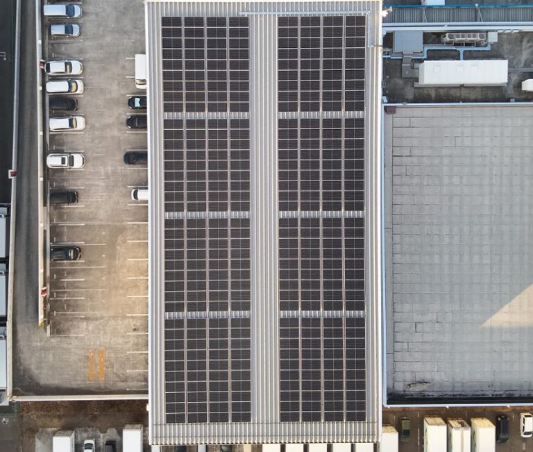2025.01.21 お知らせ仙台低温物流センター 太陽光発電設備の稼働開始2024年12月24日、仙台低温物流センターに設置した太陽光発電設備が完成しました。この設備は当社にとって初の自家消費型太陽光発電システムであり、発電した電力はEV車両の充電にも活用されます。これにより、年間約97.8トンのCO2排出量を削減できる見込みです。この取り組みは「令和6年度物流脱炭素化促進事業(国土交通省)」の対象となりました。仙台低温物流センターの屋根に設置した太陽電池モジュール(ソーラーパネル)EV車両への充電の様子 ニュース一覧に戻る