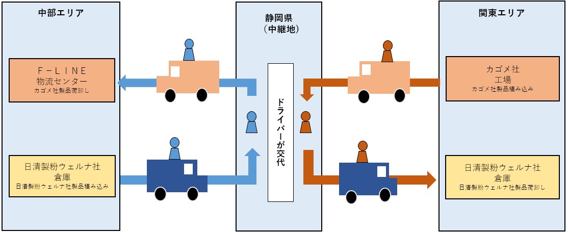 今回の取り組みでは中部エリアからのトラックと関東エリアからのトラックが中間地点である静岡県の新東名高速道路・清水パーキングエリアで落ち合い、ドライバーはトラックを交換して元のエリアへ戻り製品を納品します。