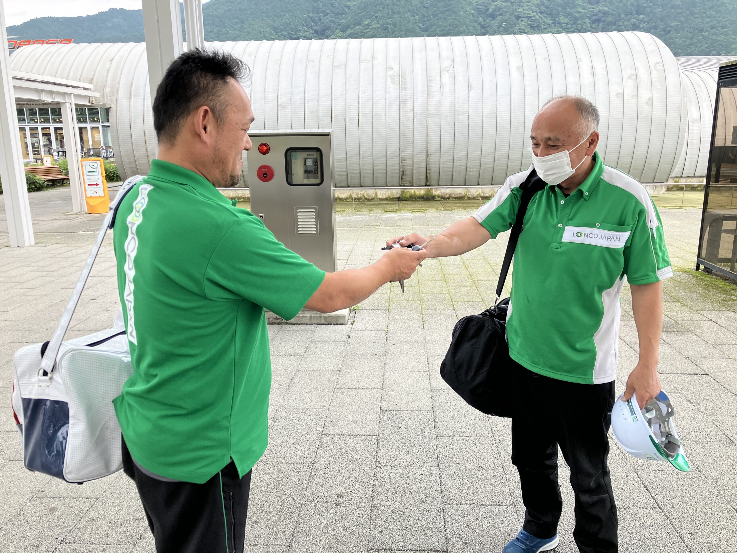 中継地でのドライバーによるそれぞれのトラックの鍵の受け渡し