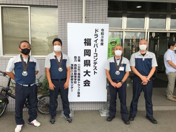 公益社団法人福岡県トラック協会主催の令和3年度ドライバーコンテスト福岡県大会が令和3年7月18日、西鉄自動車学校・西鉄バス研修センターにて開催されました。当社から福岡第一物流センター所属の中村誠・花田紘佑・川井田智裕、福岡第二物流センター所属の脇川敬介、計4名のドライバーが参加し、以下の3名が入賞しました。また入賞者の中から1名が令和3年10月23日から開催される「第53回全国トラックドライバーコンテスト」推薦選手に決定しました。
