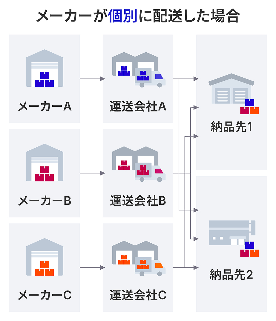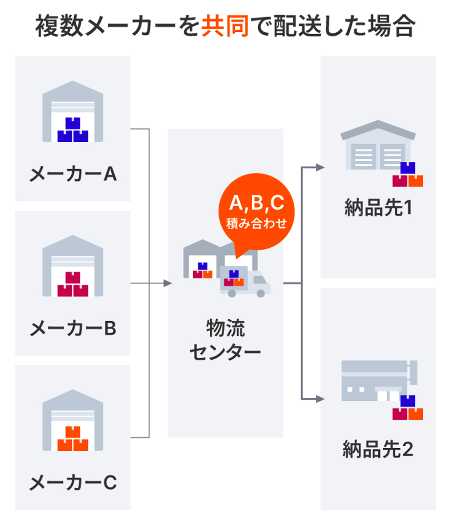 同一カテゴリーの商品を納品先様ごとに積み合わせて、まとめて配送することにより配送の効率化と環境負荷低減を実現しています。
