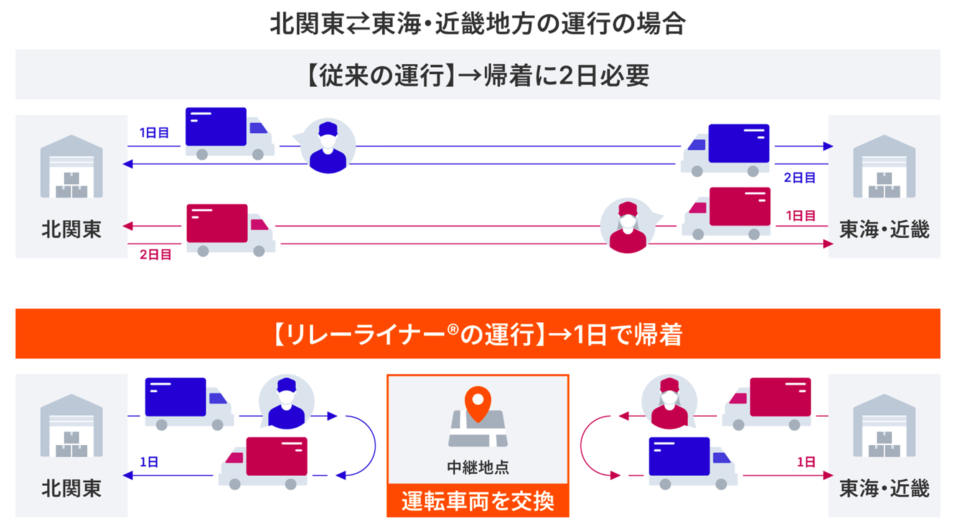 トラック輸送では、中継輸送の様々な手法(乗換方式・積替方式、大型車・トレーラー)を活用する事により、発・着地域に合わせた中継方法を設計しています。