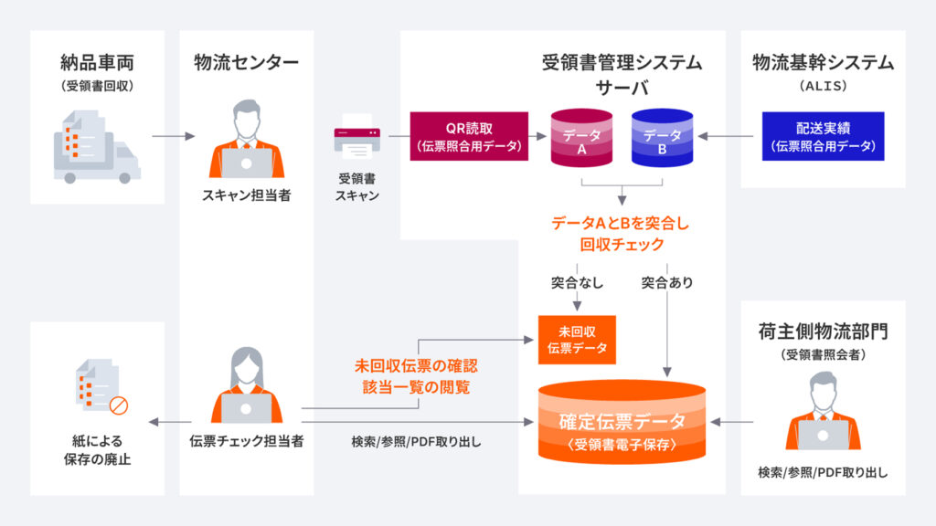 納品伝票のカット紙化とQRコードの活用により、受領書の回収確認作業を自動化しています。また、PDF形式での電子保存環境を構築しました。