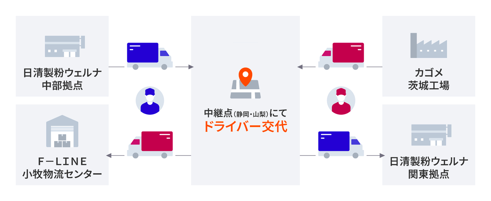 カゴメ社(関東→中部)、日清製粉ウェルナ社(中部→関東)の「中継リレー輸送」により、ドライバーの日帰り運行と往復の満載輸送を実現しました。