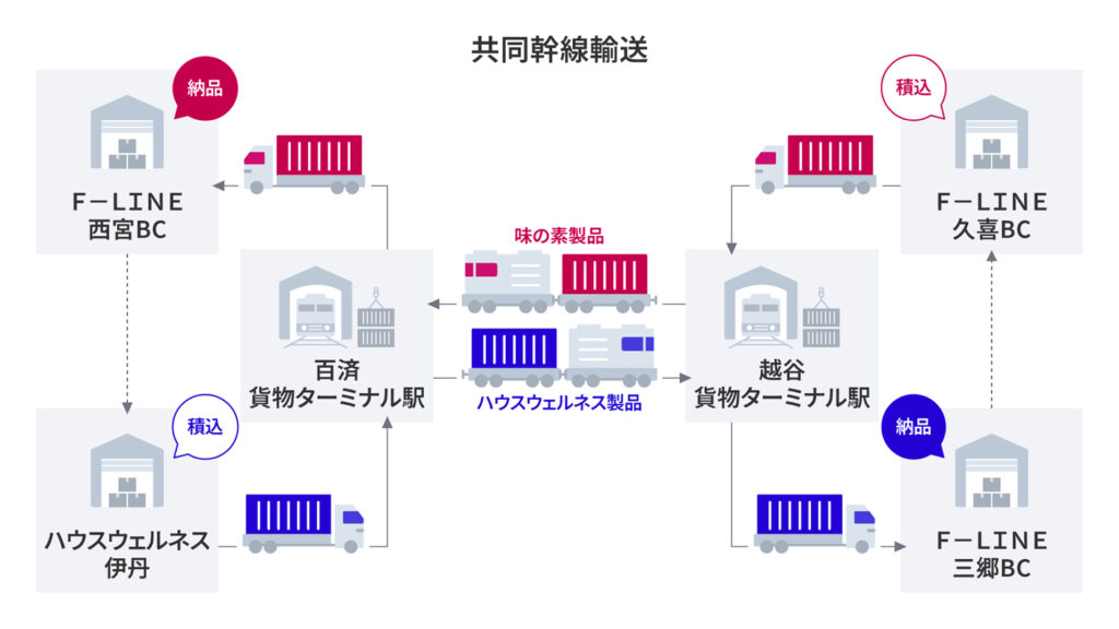 味の素社(関東→関西)、ハウスウェルネス社(関西→関東)のトラックによる片道輸送を越谷貨物ターミナル駅~百済貨物ターミナル駅の31フィートコンテナ往復運行に変更しました。