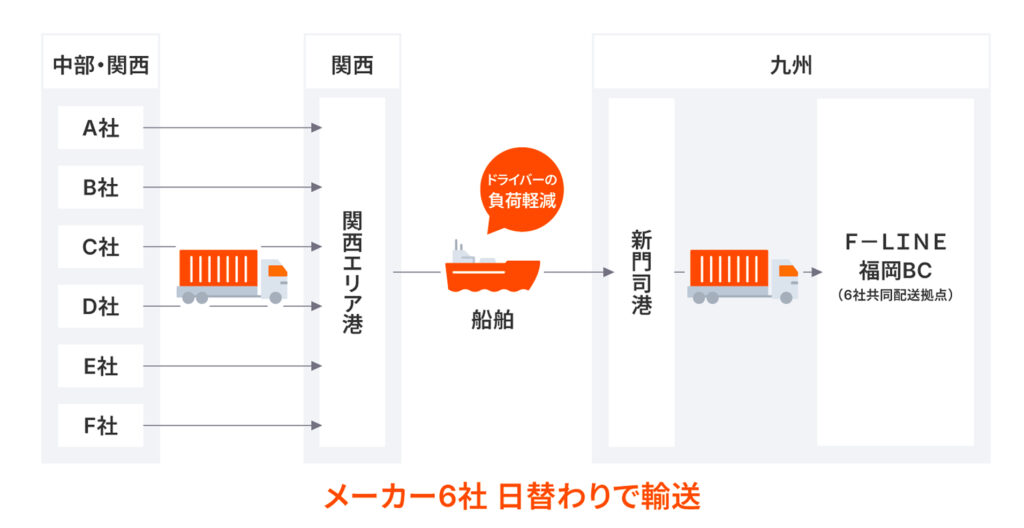 この取り組みでは6社の輸送の一部について、各社ごとに出荷する曜日を割り当て、中部・関西の各社出荷拠点から関西の港まで陸送し、関西~九州間をフェリーで定期的に海上輸送を行い、輸送の安定化とCO2削減に取り組んでいます。